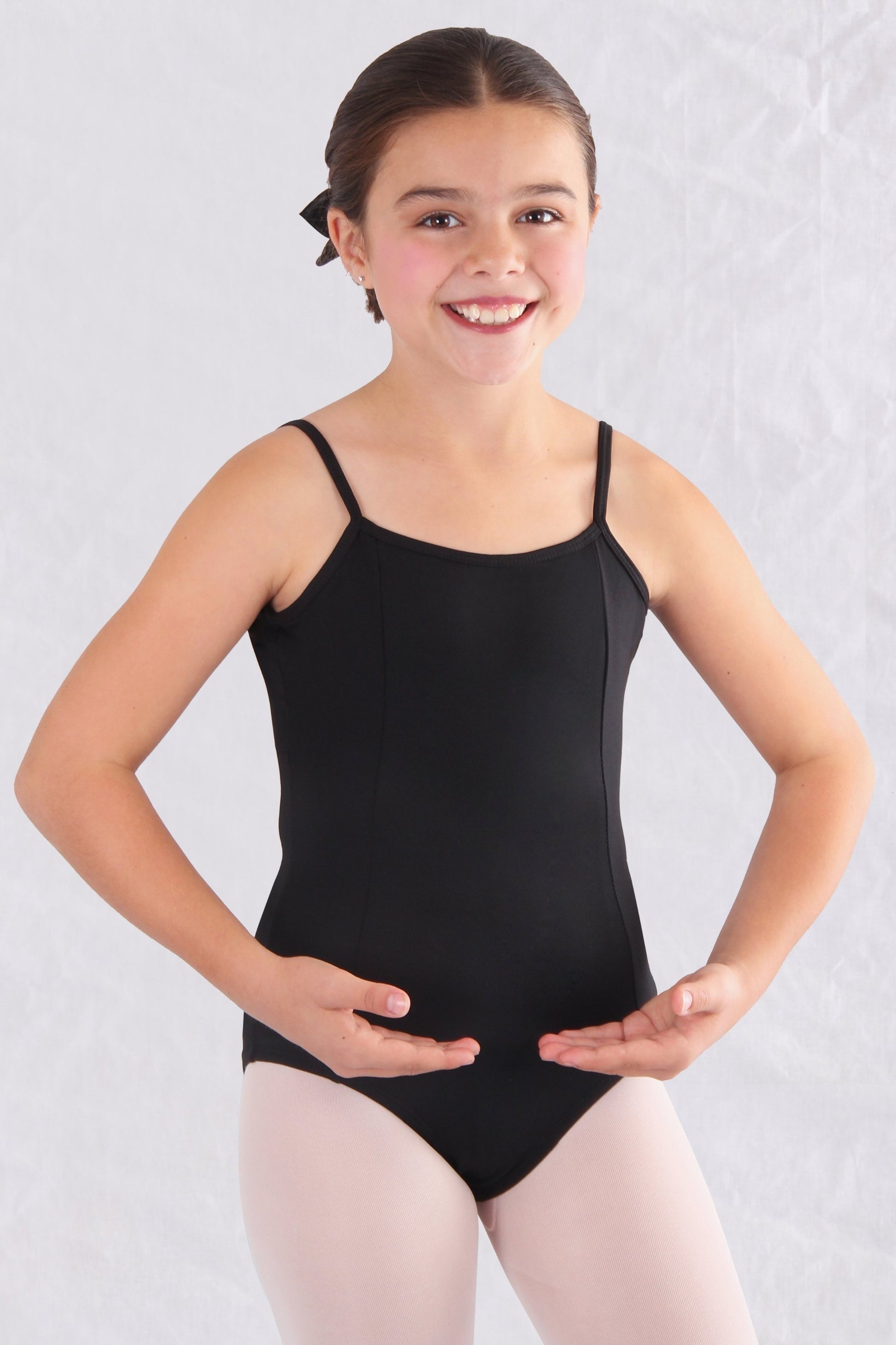 Girls Full front lining microfiber cami leotard with front princess seams and adjustable straps. Low back v neck. This leotard is the perfect one-piece for your little dancer. Your little princess will be beautiful, comfortable, and moveable in this leotard.